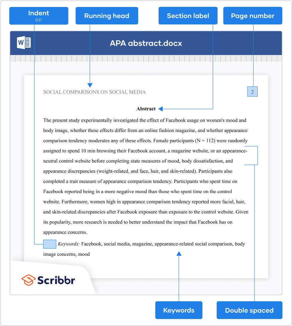 This Scribbr articleStreefkerk, R. (January 3, 2022). APA Abstract (2020) | Formatting, Length, and Keywords. Scribbr. Retrieved October 20, 2022, from https://www.scribbr.com/apa-style/apa-abstract/