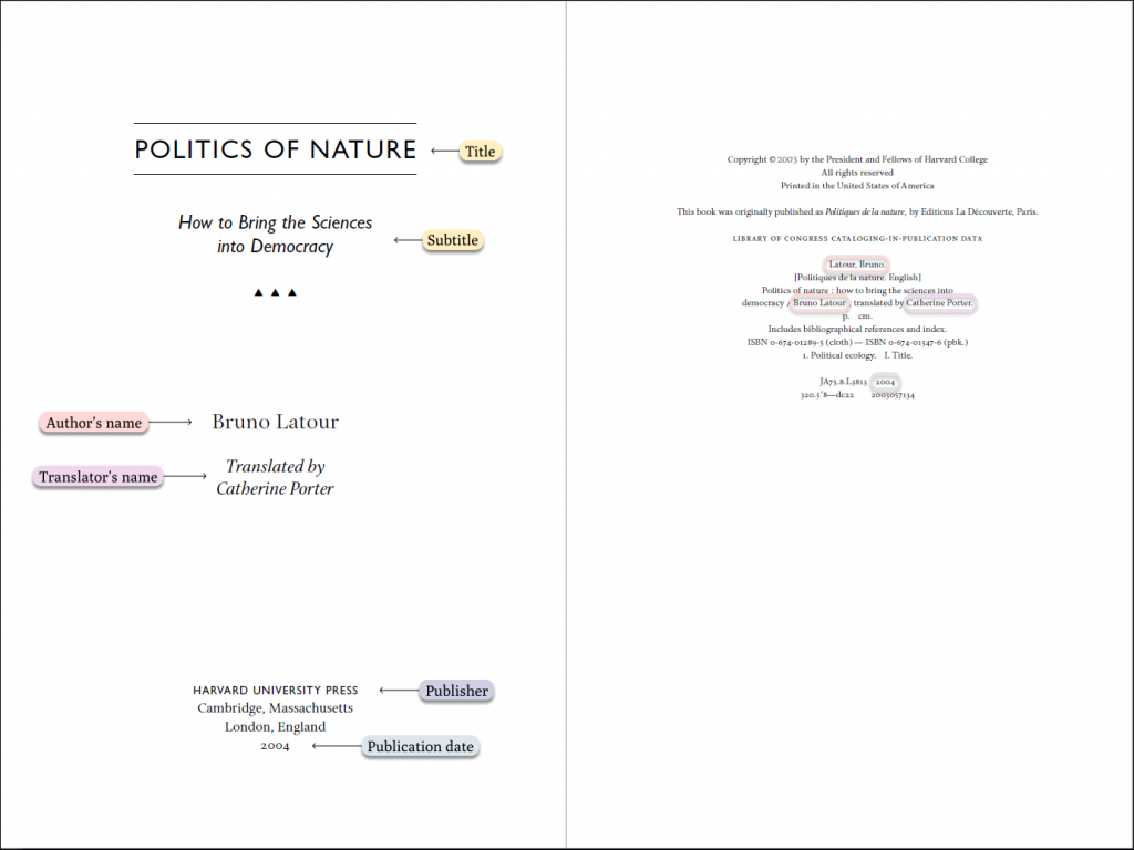 The title, author, publisher, and publication year are usually found on the book’s title page. You might have to check the copyright page for the publisher and publication year.