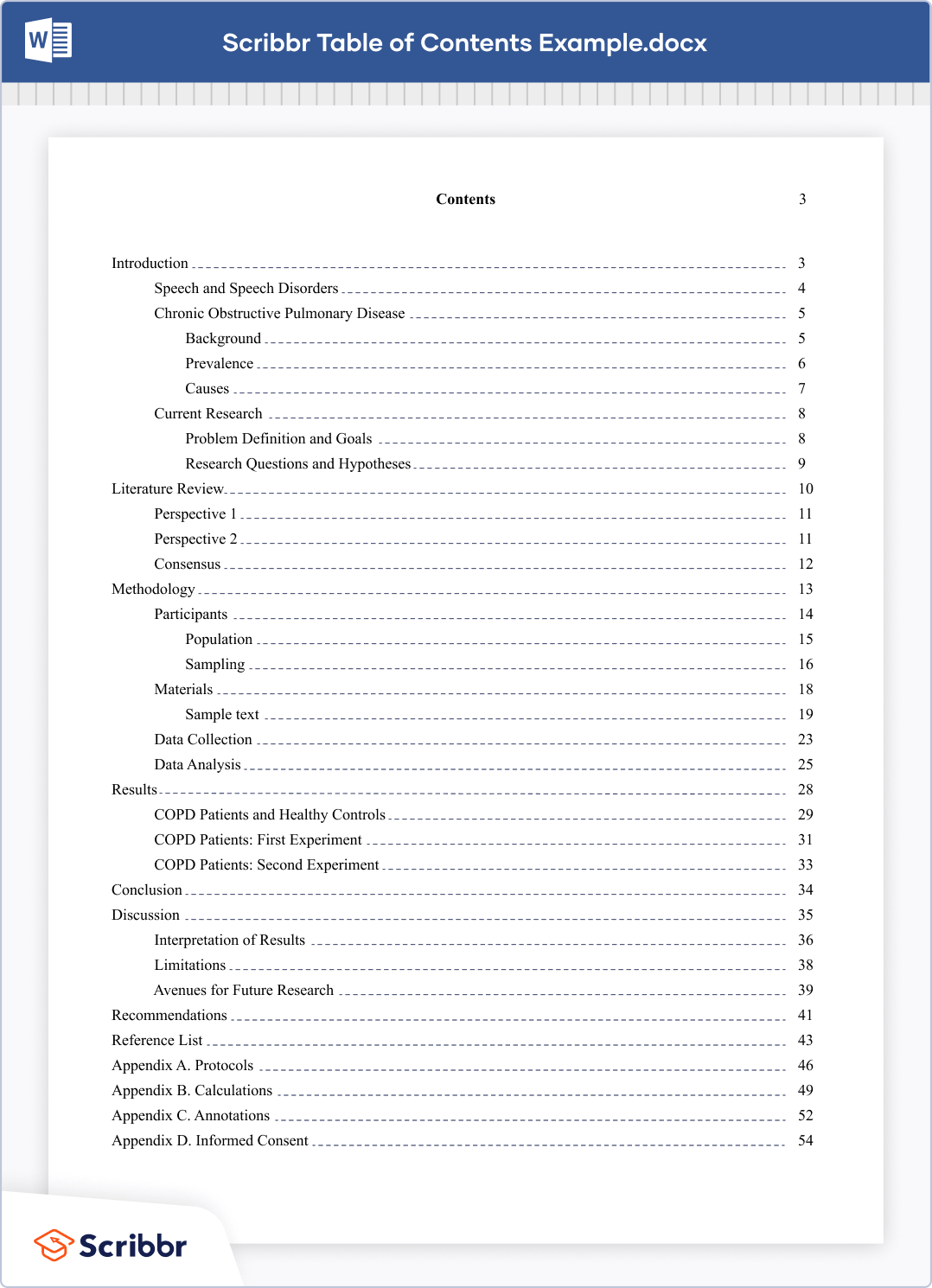 This Scribbr articleGeorge, T. (September 29, 2022). Table of Contents in Word | Instructions & Examples for your Dissertation. Scribbr. Retrieved October 17, 2022, from https://www.scribbr.com/research-paper/table-of-contents/